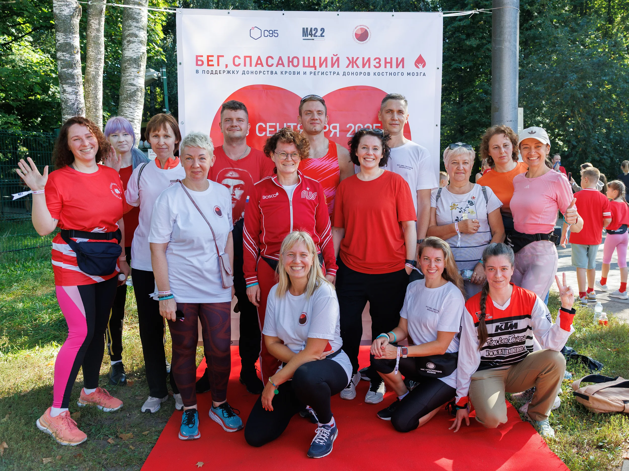 В забеге в московском парке «Кузьминки» приняли участие бегуны клуба М42,2, среди которых много регулярных доноров крови, сотрудники НМИЦ гематологии и все желающие. На дистанцию вышли: первый заместитель генерального директора НМИЦ гематологии МЗ РФ, четыре бывших пациента НМИЦ гематологии, а также четыре донора костного мозга. Все они показали отличные результаты!